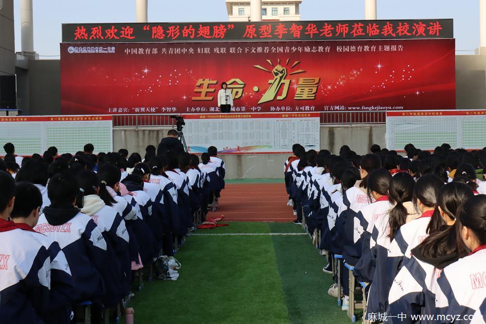 东风催桃李,丹心育新人。11月24日上午,麻城市第一中学特邀全国自立自强模范、中科院心理研究所博士、团中央青年讲师团成员、华表奖电影《隐形的翅膀》原型主人公、《鲁豫有约——无臂讲师的励志人生》栏目嘉宾李智华老师为全校师生带来励志演讲《生命·力量》。李智华老师以自己坎坷不屈的经历为全体师生上了一堂生动的励志教育课。学校党委书记、校长吴宏文,政教处主任、高三年级主任王辉,全体班主任和学生等参加了活动,活动由王辉主持。