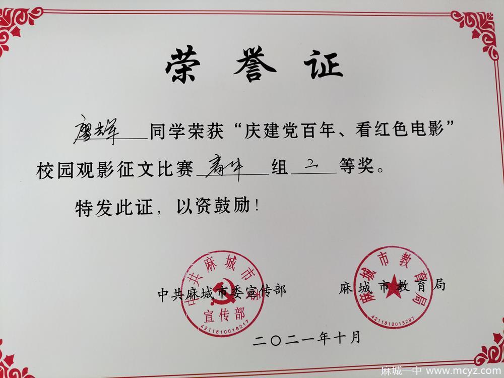 在学生征文比赛中,郑阳获黄冈市一等奖、王纯获黄冈市二等奖、俞雅获黄冈市三等奖;俞雅、王纯获麻城市一等奖,陈奕涵、廖辉、郑阳、訚冬获麻城市一等奖;我校获得黄冈市校园爱国主义教育电影放映工作先进单位”荣誉称号熊心乐老师、陈方老师被评为”优秀指导老师”