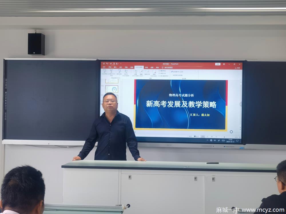 师道远而学无涯,善若水需研不倦。为增强全校教师间的交流、学习与协作,深入解读2024年湖北高考试题,促进教师精确把握新课程标准,开展好“大单元”课堂教学。2024年10月17日,麻城一中物理组开展了一场以“物理高考试题分析——新高考发展与教学策略”为主题的教研活动。会议由教研组长库凯华老师主持,学校领导高度重视,党委书记吴宏文,副校长何为、程光旭亲临指导。