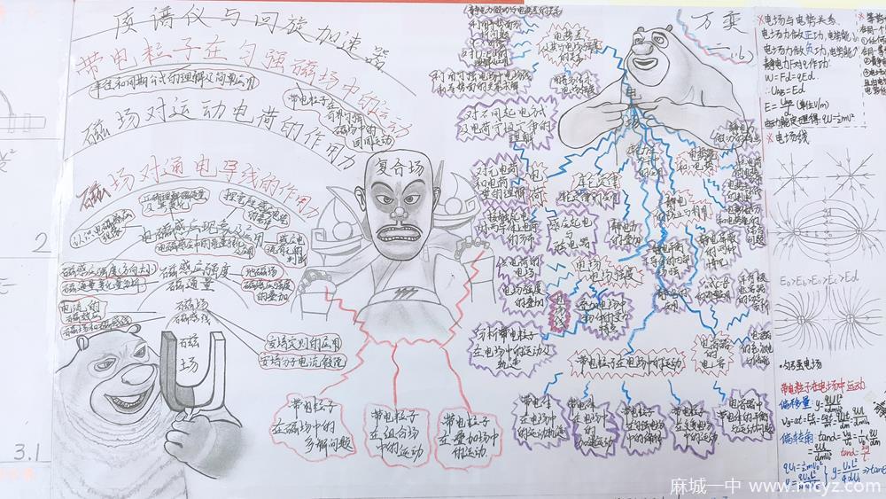 (通讯员:马茜)物理有魅力,思维有活力。为了促进学生将已学知识系统整理、归类和综合,形成完整知识体系,提高学习效率,我校高二年级物理组在九月下旬面对物理方向班级组织了物理学科思维导图绘制比赛,学生用图画、表格、树状图等方式把学过的知识呈现出来,设计巧妙,版面精美,创意不断。乍一看,是一幅精美的图画;细细端详,原来图中含有丰富的知识,高中物理各知识点内在的逻辑关系通过图示一目了然。物理学科的学习最重要的就是思维方式与学习方法,掌握了画思维导图的方法,同时对相关知识点提纲挈领、分门别类,既有利于学生提高物理学习效率,又培养了逻辑思维的严密性。